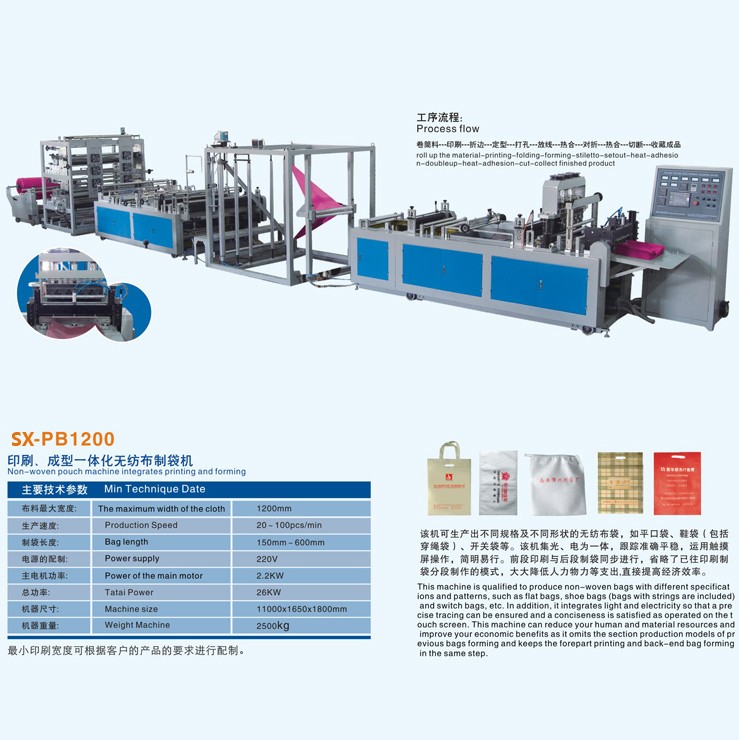 该机可生产出不同规格及不同开关的无纺布袋,如平口袋、鞋袋(包括穿绳袋)、开关袋等。该机集光、电为一体,跟踪准确平稳,运用触摸屏操作,简明易行。前段印刷与后段制袋同步进行,省略了已往印刷制袋分段制作的模式,大大降低人力与物力等支出,直接提高经济效率。