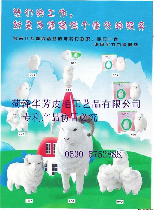 菏泽华芳皮毛工艺品有限公司是一个极具生命力和拓展力的公司。全部引进日本、美国、台湾的先近原料设备,生产出来的产品以一流的员工队伍和严谨的管理手段,树形象、创品牌、走连锁经营的道路。 成立于1988年,坐落在菏泽市丹阳工业园区c区,地理位置优越,交通便利,公司是以研制、开发、加工、销售于一体的大型公司,技术力量雄厚,各类技术人员360余人,可承接各类大型订单。 主要产品:侏罗纪大型灭绝动物高端设计制作、照相专业大老虎、博物馆真皮动物标本制作,地球野生动物动物高端制作设计、影视动物高仿道具、仿真大老虎、仿真大狮子、仿真大熊猫、照相器材仿真动物背景、仿真羊~狮、老虎等仿真宠物,仿真动物,真毛宠物,皮毛玩具,真皮动物,皮毛工艺品,真毛宠物,裘皮工艺品,时尚宠物,真皮动物,皮毛动物,裘皮玩具裘皮动物,仿真玩具 ,仿真工艺品,仿真动物,真皮工艺品,毛皮玩具,毛皮工艺品,毛皮动物,毛绒玩具,毛绒工艺品,毛绒动物,绒毛玩具,绒毛工艺品,绒毛动物,真毛玩具 ,真毛工艺品,真毛动物,仿毛玩具,仿毛工艺品,仿毛动物,民族工艺品,民间工艺品,手工工艺品 宠物玩具为主,真皮毛,深加工,品种繁多,造型流畅,动态逼真,栩栩如生,产品已远销美国、韩国~日本、德国`~澳大利亚和国内大中型城市。 公司守合同,重信誉,保证质量,恭迎国内外客户来公司洽谈、合作。 我们愿为所有渴望成功 、勇於拼搏 、具有创新精神的各界人士提供了良好的发展平台,为您的事业早日成功推波助澜,您的需求正是我们的追求 。 热切期盼能与更多的海内外客商携手并进,共创辉煌 。
