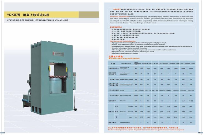 YDK系列框架液压机适用于五金、电器、表带、砂轮、塑料橡胶、压花、复模等行业制品成形。YDK-1000至2000T以上机型特别适用于不粘锅底部的压花工艺及电磁炉用的铝质锅、压力锅和不粘锅的不锈铁片复底冷挤压入工艺。