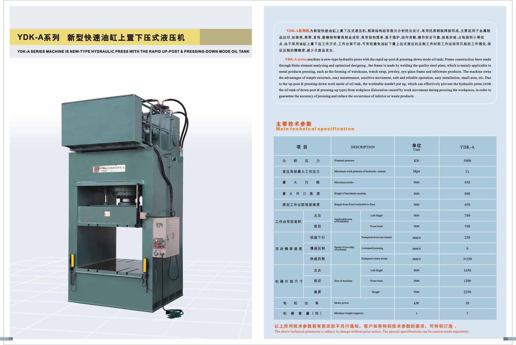 YDK-A系列框架下压式液压机适用于铝运动水壶、电容器外壳、铝药瓶、茶业罐、摄像头外壳等铝壳的冷挤压成型;不粘锅底部的压花工艺及电磁炉用的铝质锅、压力锅和不粘锅的不锈铁片复底冷挤压入工艺;以及其它金属制品的冷挤压成型。