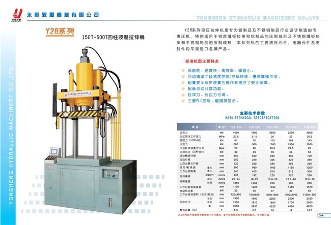 我司生产的Y28系列四柱式双动液压拉伸机主要适用于薄板拉深、成形、翻边等压制工艺。规格从35T至1200T。主要液压元件、电器元件及密封件均采用进口名牌产品。更可选择配置变压边力拉伸功能,更好的满足高档产品的拉伸要求。