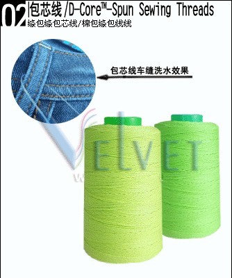 “VELVET”牌包芯线是采用涤纶短纤包覆涤纶长丝的出口材料.包芯线既有涤纶短纤的外观以及低收缩的功能又因加入涤纶长丝增强了本产品的拉力.由于包芯线用于牛仔洗水效果优于普通SP线(见图)不起毛,不断线,广泛应用于欧美以及国外牛仔成衣企业.为了提高生产效率,很多成衣企业的高速针车达到5000转/分钟以上的速度,普通SP线因不能耐高热或拉力不够断线,所以最理想的缝纫线就是采用涤纶包芯线.我厂生产基地位于广东本土,生产制造成本远低于美国和英国或香港的同行企业.很多品牌服装单位在近两年与我厂建立了良好的合作关系.包芯线的特性和优点突出体现在很多军用品,涧棉产品,皮具业,沙滩鞋,衣服珠边都有在选用并有替代普通线的趋势,由于我厂在国内介入包芯线较早,生产能力非常成熟.包芯线也是我厂的优势拳头产品之一,市场上所有的规格产品我厂都可生产(从8支到60支的2、3、4股)现在规格:602.603.452.402.403.292.293.302.303.162.163.152.153.123.202.203.204