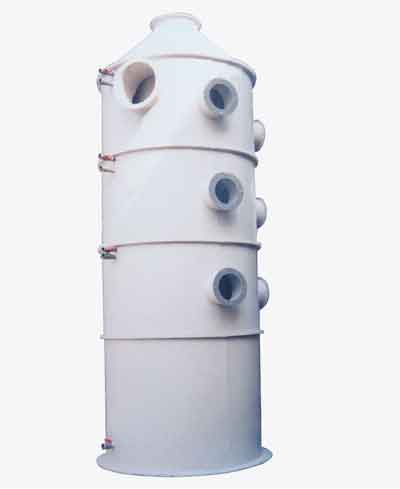 结构形式:本设备分单塔体和双塔体。采用圆形塔体,用法兰分段联接而成。具体由贮液箱、塔体、进风段、喷淋层、填料层、旋流除雾层、出风锥帽、观检孔等组成。