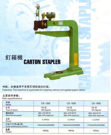 本公司与台资企业合作生产高速钉箱机, 全部零件从台湾进口在大陆组装,该机是在普通订箱机的基础上改进的新产品。其构造坚固耐用(合金材料),品质优良,钉箱速度快,效率高,节省成本,噪音非常低,采用先进的电磁离合装置代替传统的机械离合器,维修少,使用轻便,快捷。是二十一世纪最理想的纸箱钉箱机。