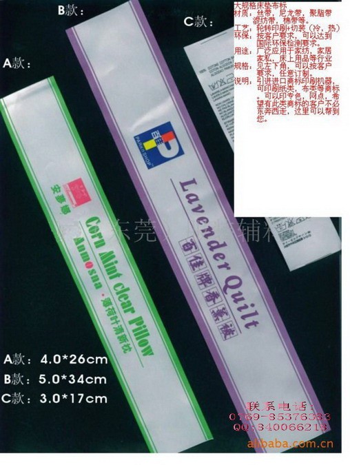 普通洗水标、床上用品大标、各种材料布标,洗水不脱色布标、环保布标、各种特殊切装布标、多色高难度印刷布标、各类唛头。