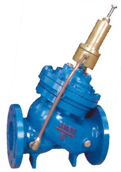3、缓闭过程:水泵停止运行,主阀分两极关闭,先快速关闭90%,再缓慢关闭,从而清除了水锤.(注:1、控制导阀亦可用电磁取代.2、接在主阀体出口的控制管路同样可接在其他水膜上,水源压力不低于1Kg/cm2)