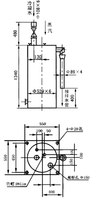 JD-1PS-20型煤气管道单管二室冷凝水排水器(水封高度2040mm) 一、概 述 1、本排水器适用于计算压力低于15000Pa的各种煤气管网。 2、排水器不设固定给水管,采用在观察处定期检查给水的办法,第一次开工灌水时,需打开顶盖上的DNlin管帽排放空气。 3、插入敞开室的DNlin蒸汽管,视南北方地区的气体条件决定是否需要接上外部蒸汽管,南方地区不接蒸汽管时需用管帽盖上。 4、排水器两个室水封总高度2040mm,水容积为0.251m3,水位高度1200mm。