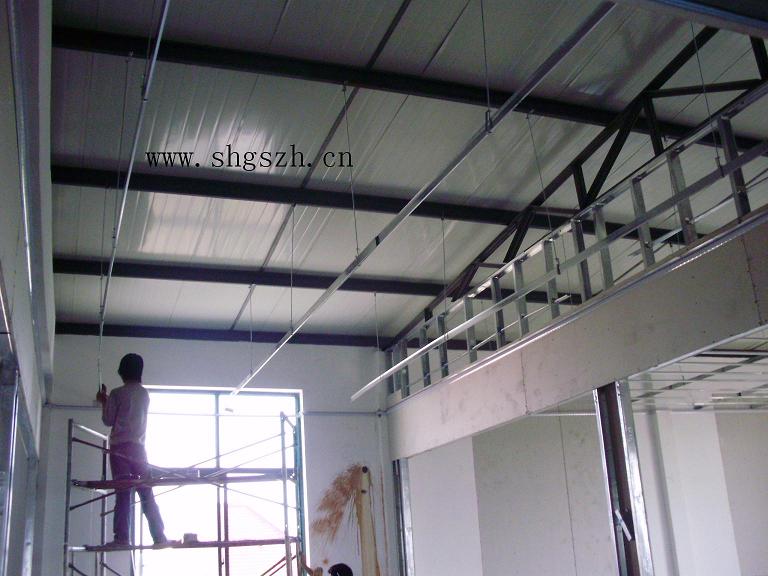 公司专业承接吊顶隔墙工程.021-37690904 13918540004 www.shgszh.cn 销售轻钢龙骨 烤漆龙骨 TK板 压花石膏板 泰山石膏板 拉法基石膏板 阿姆斯壮矿棉板 赛亚牌矿棉板 铝合金龙骨 铝扣板 铝隔珊 长条扣板 彩钢棚 彩钢夹心板隔断雨棚搭建等装饰材料.公司另有水电工 木工 油漆工 环氧地坪工承接工程安装服务.本公司承接厂房 办公室 车间 工厂等装修业务.