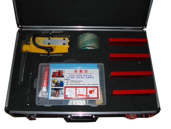 磁压式堵漏器最大吸附力可达300公斤以上。内压1.8公斤以内。需配合堵漏胶使用。器材包括:磁压器一个,极靴四块,东方神胶两组,不干胶一卷、铝合金携带箱一个。