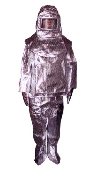 隔热服分为复合铝箔防火布、阻燃隔热毡、舒适层和复合铝箔防火布、舒适层两种。具有防火、隔热、耐磨、耐折、阻燃、反辐射热等特性,反辐射热温度500-1000℃等显著特点。是消防员及高温作业人员近火作业时穿着的防护服装。款式分为:分体式或者连体式。整套包含上衣,下裤,头罩,手套,护脚。规格分为:特、大、中、小号。