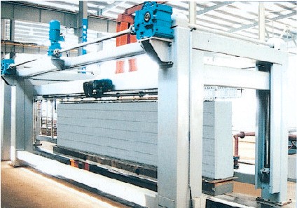 翻转吊具把模具空中翻转90度以后脱模把坯体连同模具侧板放置在切割台上,纵向切割装置通过电机带动自身行走,对放置于切割台上的坯体进行行走切割,切割完成后行走至暂停位置,横向切割装置通过电机带动自身行走到坯体中央停止后再进行水平式切割,横切架自上而下垂直降落切割直至上升复位。
