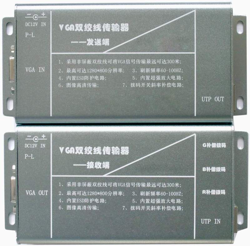为了解决VGA信号较长距离的传输时,发生的图像重影,颜色失真等问题,北京麒麟视讯科技有限公司研发生产了这款双绞线VGA传输器,可以传输距离为0--300米,是专为网络平板显示及大屏幕幕墙显示广告工程、工业自动化控制、医疗设备、安防监控、多媒体教学等显示系统工程中高质量VGA视频信号长距离传输的需求而专业设计的集VGA信号转换、分配、驱动、接收和还原功能为一身的信号传输系统。它可以将VGA信号通过非屏蔽五类网线上平衡传输,以增强对共模噪声及干扰信号的抑制,同时大幅度地节约线材成本并简化了工程布线。采用专利技术将H和V信号编码至RGB信号上加重处理后发送,仅利用CAT-5电缆的三对双绞线完成VGA、SVGA、SXGA、XGA、SXGA的RGBHV信号的平衡编解码,并采用远距离高频补偿加重处理,带宽高达350MHz。使XGA(最高1600*900/60Hz)的传输距离达到300米,以满足大型工程投影机、显示器、TFT-LCD TV、PDP信号传输的需要。由于整个传输系统采用了加权零值拆分的平衡传输的专利技术,因此双绞线在传输信号时不会对外造成EMI的干扰。可通过设置拨码开关来调整传输距离的远近。