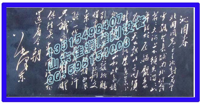 山东佳润雕刻设备厂、一直致力于雕刻机的研发、生产、销售,本厂生产的JR-9型雕刻机的特点:使用成本低、基本没有维修费用、无粉尘污染、雕刻速度快,质量好,能在各种硬质材料上雕刻如:大理石、花岗岩、青石、玉石水晶、玻璃、陶瓷等材料上雕刻,能在材料的平面、球面、凹面进行线雕、浅浮雕,字体、图案的深浅,圆底、平底随意可控。雕刻速度比人工快十倍甚至百倍,精度更是人工所不及!