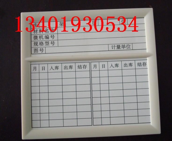 磁性材料卡、磁性标签卡、材料卡、物资标牌-1 3 4 0 1 9 3 0 5 3 4/0 2 5 8 3 3 6 4 7 2 1/0 2 5 8 5 5 6 1 5 7 5/1 3 3 8 2 7 6 1 7 3 6由ABS工程塑料制成,广泛应用于机关、部队、企事业单位的仓储管理。它背面特有的强磁材料,可以直接吸附在货架上,下部有记录库成量的转盘,规格有A、B、C、D、E、F、G、H、等,可以使它直接吸附在铁质货架上,上半部份插卡片,记录材料名称、规格、型号,下半部份转盘显示库存数量,转盘有定位,有A型、B型、C型、D型、E型、F型、G型、H型、K型,E型可以直接记录入库、出库、库存量,适用于企业的认证、升级、创一流。该产品经全国各地供电局、电厂、炼油厂、钢铁厂、造纸厂、电子企业、机械制造业、自来水公司等单位使用效果良好.--1 3 4 0 1 9 3 0 5 3 4/0 2 5 8 3 3 6 4 7 2 1/0 2 5 8 5 5 6 1 5 7 5/1 3 3 8 2 7 6 1 7 3 6