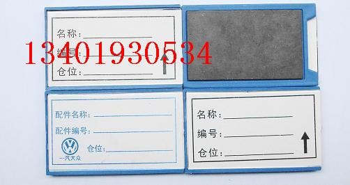 物资标牌、磁性材料卡、磁性库位卡、标牌--1 3 4 0 1 9 3 0 5 3 4/0 2 5 8 3 3 6 4 7 2 1/0 2 5 8 5 5 6 1 5 7 5/1 3 3 8 2 7 6 1 7 3 6由ABS工程塑料制成,广泛应用于机关、部队、企事业单位的仓储管理。它背面特有的强磁材料,可以直接吸附在货架上,下部有记录库成量的转盘,规格有A、B、C、D、E、F、G、H、等,可以使它直接吸附在铁质货架上,上半部份插卡片,记录材料名称、规格、型号,下半部份转盘显示库存数量,转盘有定位,有A型、B型、C型、D型、E型、F型、G型、H型、K型,E型可以直接记录入库、出库、库存量,适用于企业的认证、升级、创一流。该产品经全国各地供电局、电厂、炼油厂、钢铁厂、造纸厂、电子企业、机械制造业、自来水公司等单位使用效果良好.--1 3 4 0 1 9 3 0 5 3 4/0 2 5 8 3 3 6 4 7 2 1/0 2 5 8 5 5 6 1 5 7 5/1 3 3 8 2 7 6 1 7 3 6