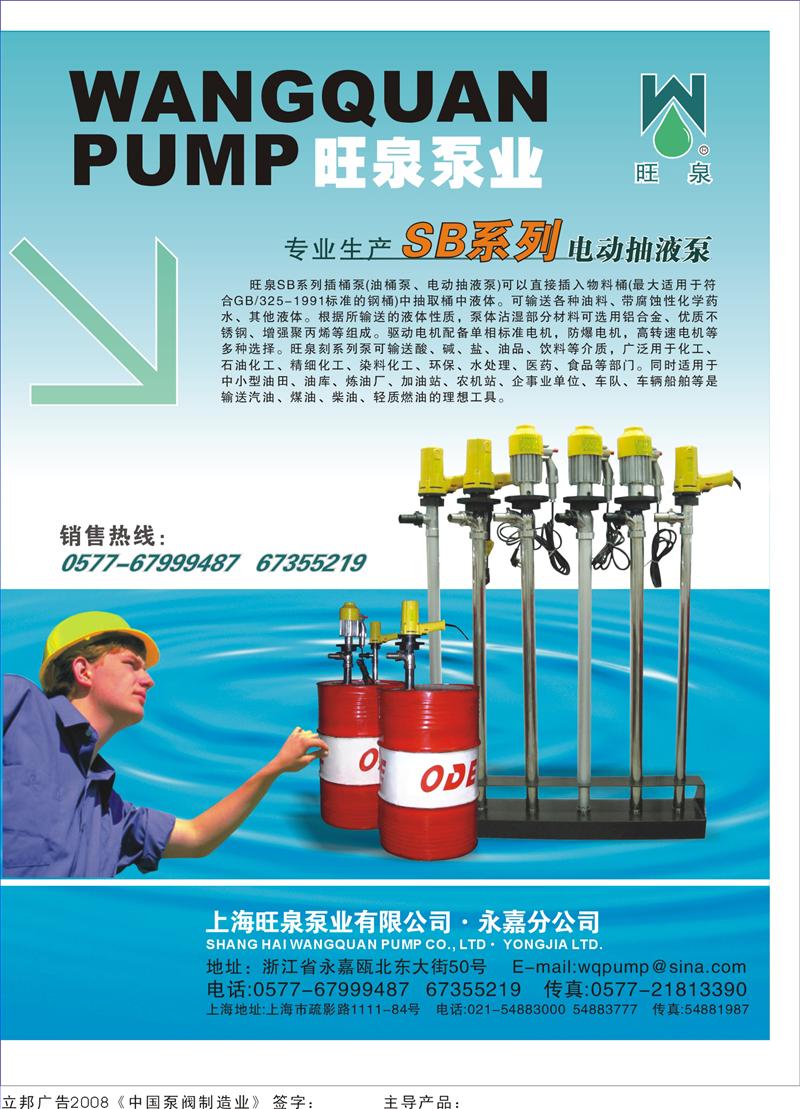 旺泉SB系列电动抽液泵是引进西德先进样机研制而成,特点为超高速轴流泵,无需加引灌水。最大适用于符合GB/325-1991标准的钢桶,本泵适用于工厂、矿山、商店、钻井队、油库、酒厂以及农村个人抽取水源之用。本泵可提升柴油、齿轮油等石油类及各种食用油等各种油品,使用全不锈钢型泵,还可用于化工企业抽吸一般酸碱液体。