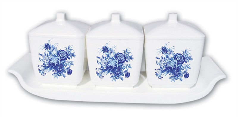 美吉仿瓷调味罐,是目前仿陶瓷风情况下,仿造了陶瓷的外形、颜色、花纹进行设计,采用无毒材质,保证客户安全放心使用和食用。每套调味罐由三个调味料储存杯(带盖)、三个小勺子和一个地盘组成。且内置的小勺子可以控制烧菜调味料的份量。当我们将常用的调料如盐、鸡粉、糖等统一放整齐,加上调味罐本身的陶瓷特性青花花纹让整个厨房显得别具一格。每个大杯量的调味料储存北可以容纳市面上普遍的200克调料!