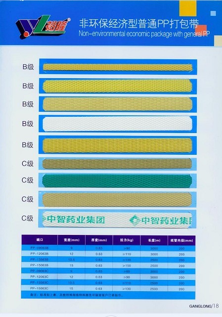 公司生产的半自动,全自动机用打包带及手用打包带,按用料不同分为:通用级,优质级,半透明及全透明级,产品规格可定做宽度:4.5mm-20mm,厚度:0.4-1.5mm,拉力可达到50-300kn。