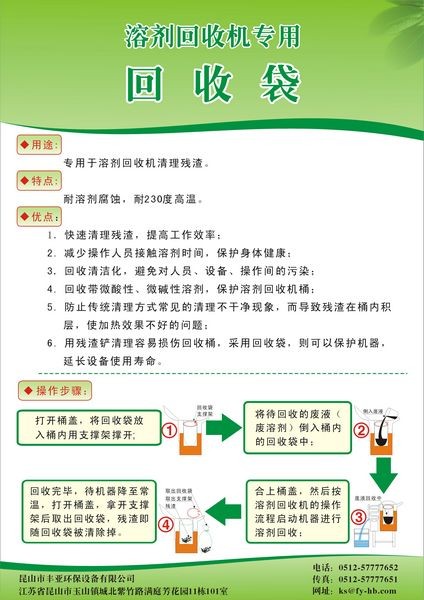 用于溶剂回收机清理残渣,耐腐蚀耐高温,快速清理残渣,提高工作效率。减少操作人员接触溶剂时间,保护身体健康,回收清洁化,为避免对人员对设备和操作间的污染,回收微含酸碱性溶剂,保护回收机内桶,防止原始清理方式常见的清量不干净现象,而导残渣在桶内积层,使加热效果不好的问题,用残渣铲清理容易损坏回收机内桶,采用回收袋可以保护机器,延长设备使用寿命。