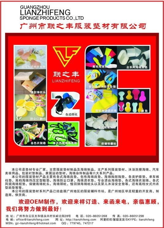 广州市颇具名气,有相当规模的服装垫材专业厂家,"联丰"牌全系列海綿肩垫是本厂的老牌优质产品。