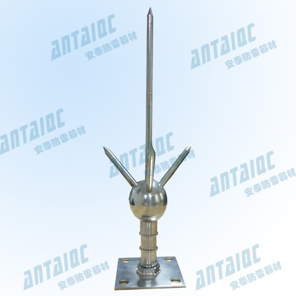 一、产品特性:双球状单针型雷电接闪器,是一条无感性,低阻抗的金属内导体引下线,把接闪后的雷电电流输送到大地,并使被保护的天线铁塔或建筑物不发生侧击和带电。 二、适用范围:无线通讯基站、易燃、易爆仓库、高层建筑、大学、医院、民用、军用船舶、机场历史性建筑物、赛马场、运动场化学品、橡胶、油库、气象台站、石油气站、军事基地矿场等。 三、技术参数最大放电电流:300KA 抗风强度:40m/s 球径:Φ60mm 针径:Φ10mm 针长:235mm 总高:385mm底座:10*10mm