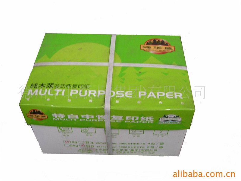 复印纸:克重/规格: 80g/a3、70g/a3、70g/a4、70g/b4、70g/b5、70g/8k、70g/16k 详细描述: 1.akd中性施胶,不腐蚀机器,不掉纸粉,不发黄变脆。 2.专业复印机高速测试,卷曲度小,不会产生多张送纸现象。 3.高温高压不产生有害酸/碱性气体,不磨损复印机零件。 4.白度好,色泽柔和不伤眼睛。 5.采用原厂制造复印纸,质量长期稳定。 6.裁切质量与数量自动控制,保证每包500张。 7.包装专业覆膜,防潮性能极佳。 8.两种含量,双重选择。