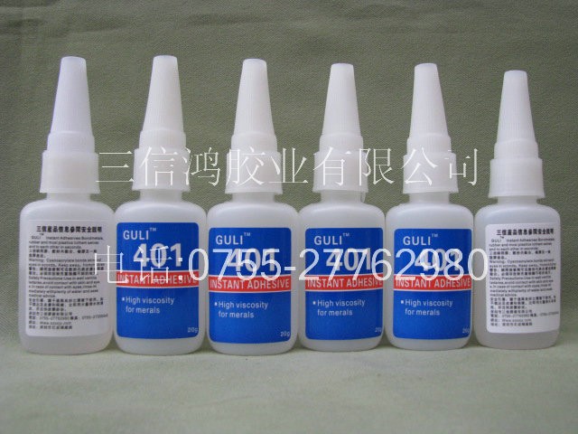 深圳市三信鸿胶业有限公司生产销售的400快干胶系列。低白化,高强度。通用及常用型其对于金属、塑胶、橡胶以及惰性材料与常规材料粘接。401其粘度适中,决定其渗透性;可达缝隙深处,起到快速固定和粘接作用,其成分:a -氰基丙烯酸甲氧基乙酯Methoxyethtl cyanoacrylate Adhesive低白化,低气味,单组份,中速固化,粘接材料广泛,适用于P+R.....电器、仪表、机械、电子、光仪等行业适用