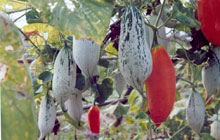 变色瓜也称彩瓜、白粉瓜,因其两头小中间大,俗称其老鼠瓜,是葫芦科栝楼属一年生攀援性草本植物,原产印度、马来西亚一带,是一种非常新奇的瓜菜,特别适宜在科技园区和院种植,观赏食用兼得。变色瓜依瓜皮条纹分青皮白条和白皮青丝二种,根系特别发达,蔓长6-8米,生长势特别旺盛,叶深绿色,两面密生茸毛,掌状,叶脉放射状。雌雄同株异花,因此结瓜率特强,瓜形奇特,两头尖中段粗,瓜皮以白绿为主,间有绿色细条纹,果肉白色,单瓜重200-300克,嫩瓜食用味道好,炒菜或做汤,口味清香。留种成熟的种瓜色彩红艳,经久不落,非常美丽。变色瓜产量奇高,单株可结果200-300个,种上2-3株全家食之不尽,结果期长达4-5个月。变色瓜适应性强,对光照要求不严,耐高温,耐干旱,我国南北均可种植,每年2-6月均可播种,对土壤适应性很广,但以排水良好的沙壤土或粘壤土为宜。需搭高架棚种植,亩栽300株,亩产万斤以上,可自己留种。试种每份20粒20元,