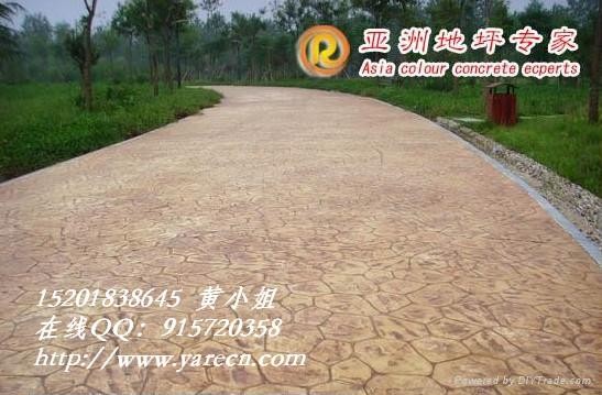 彩色压花混凝土艺术地坪(彩色地坪、艺术地坪、压花地坪、压模地坪、压印地坪、景观地坪)是在摊铺好的砼表面上,在砼表面析水消失后用干撒彩色强化剂(干粉)的方法对砼表面进行上色和强化,并使用专用工具将彩色强化剂抹入砼表层使其融为一体;待表面水份光泽消失时,即均匀施撒彩色脱膜养护剂(干粉),并马上用事先选定的模具在砼表面进行压印,实现各种设计款式、纹理和色彩。