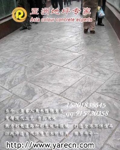 面层是一种无毒不挥发的专用化学材料。基本工艺是在摊铺好的混凝土表面析水消失后上,用干撒彩色强化剂(Color Hardener干粉)的方法对混凝土表面进行上色和强化,并使用专用工具将彩色强化剂抹入混凝土表层使其融为一体:待表面水分光泽消失时,均匀施撒彩色脱模养护剂(Release Agent干粉),并马上用事先选定好的模具(Texture Mats)在混凝土表面进行压印,高压冲洗并待混凝土面层干燥后,用专用工具将保护剂(Sealer)喷洒或涂刷在混凝土面层,这样,实现各种设计款式、纹理和色彩,达到天然材料的质感,例如板岩、石灰石、花岗岩、沙岩、木头和圆石的效果。