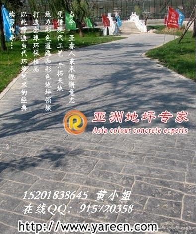 压印混凝土艺术地坪(彩色地坪、艺术地坪、压印地坪、压花地坪、压模地坪、景观地坪、地坪材料)是一种防水、防滑、防腐的绿色环保地面装饰材料, 是在未干的水泥地面上加上一层彩色混凝土 ( 装饰混凝土 ) , 然后用专用的模具在水泥地面上压制而成。彩色混凝土能使水泥地面永久地呈现各种色泽、图案、质感,逼真地模拟自然的材质和纹理,随心所欲地勾划各类图案,而且愈久弥新,使人们轻松地实现建筑物与人文环境,自然环境和谐相处,融为一体的理想。