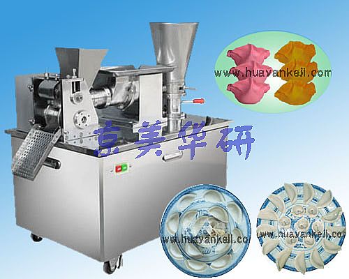 传统饺子机成形的饺子是一面起“肚”,充馅是灌肠式,饺子馅里的肉与蔬菜必须呈泥状,不能多加馅料,蒸煮出的饺子口感发粘,不爽口;同时,由于面皮里的淀粉已回生,蛋白质部分变性,面皮的延伸性和可塑性变差;蒸煮出的饺子体积小、不起发、色泽暗。本机工作时,经过轧辊的压延,使面团中的面筋网络达到均匀分布,加工性能提高,可加大馅料的充填量。本机独特的包合成形技术,使包制的饺子两面起“肚”,形同手工水饺;可包制颗粒状的馅料,馅中能多加20%的汤汁。蒸煮出的饺子形态饱满,馅大皮嫩,爽口、多汁有味,色泽白润。这些都是传统饺子机无法做到的。