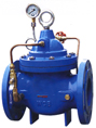 工作原理:水力控制阀分隔膜型和活塞型两类,主要部件有一个主阀及其附设的导管、导阀、针阀、球阀和压力表等组成的。它利用上下游压力差为动力,由导阀控制、使隔膜(活塞)上方控制室内的压力水被排到大气或下游低压区时,作用在阀盘底部和隔膜下方的压力值就大于上方的压力值,所以将主阀阀盘推到完全开启的位置,当进入隔膜(活塞)上方控制室内的压力不能排到大气或下游低区时,作用在隔膜(活塞)上方的压力值就大于下方的压力值,所以就会把主阀阀盘压到完全关闭位置,当隔膜(活塞)上方控制室内的压力值处于入口压力与出口压力中间时,主阀阀盘就处于调节状态,其调节位置取决于导管系统中的针阀和可调导阀的联合作用。可调导阀可以通过下游的出口压力并随它的变化而开大或关小其自身的小阀口,从而改变隔膜(活塞)上方控制室内的压力值,控制主阀阀盘的调节位置。