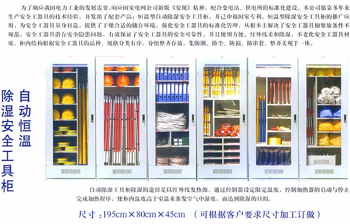 (山东智能安全工具柜,电力安全工具柜,安全工具柜,智能安全工具柜,除湿烘干工具柜,温湿双控工具柜,智能工具柜,普通型安全工具柜,恒温除湿工具柜)随着电力安监部门管理水平进一步提升,现有安全工器具的存放方法已经显现安全隐患。对电工作业工具的保护和正确使用提出挑战。我公司最新开发安全工器具的新型配套产品——集防潮、除湿、防尘、防损、整齐美观于一体的智能安全工具柜系列产品。 安全工具柜外壳使用优质冷板,采用艺术型静电喷涂,柜门选用高强度钢化玻璃,外观大方、美观。我厂依据电力安全工器具放置的现场的大小及安全工器具的各类、数量设计定作。每个智能绝缘工具柜至少存放如下工具:a. 绝缘手套:四副;b. 绝缘靴:四c. 令克棒:六根;d. 接地线:四副;e. 验电器:六只。也可按客户要求放置如:安全帽,围网,安全带,验电器,标示牌等适用场所:电力系统、通信系统、微机房、精细电子元件加工厂等场所。公司产品开发部将根据客户要求,不断开发多项非标的机柜、箱体.欢迎来人来电订购(15054325293),执行价格全国最低!!!
