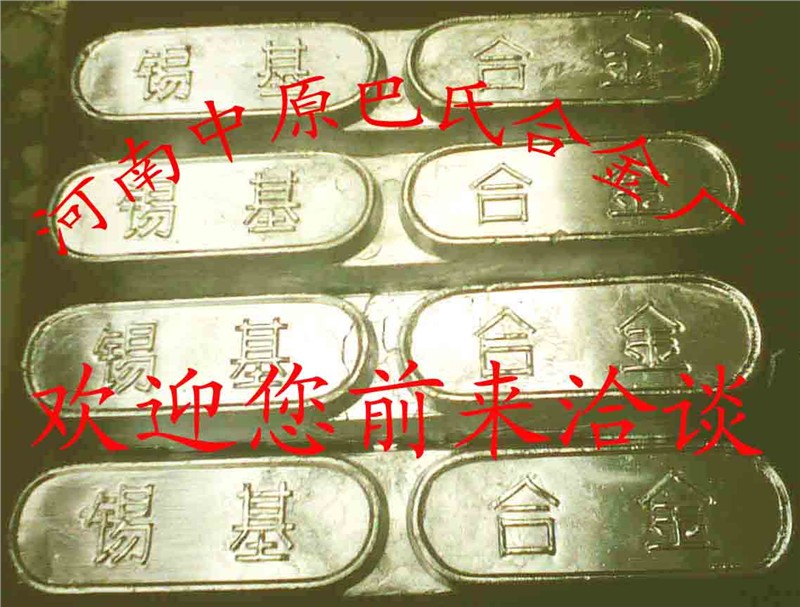 我厂生产各种型号的锡基合金,铅基合金,焊锡,具有耐磨,耐腐蚀,耐高温,抗震,抗压等优点。主导产品锡基合金4—4,8—4,11—6,2—4—10,15—2—18。铅基合金16—16—2,15—5—3,15—10,10—6。质量上乘,性能可靠,价格优惠。主要用于水泥厂球磨机设备的球面瓦,船舶螺旋机械轴瓦,轴套;造纸厂打浆机,烘缸机轴瓦;船舶螺旋机械轴瓦,轴套。压缩机械轴瓦,轴套;轧钢机轴瓦;化工机械,石油机械等等其它大型机械设备的轴瓦,轴套,轴衬。电梯吊索具所用巴氏合金。