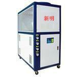 新明冷水机有风冷式和水冷式冷水机 风冷型冷水机 “新明”牌系列工业冷水机可提供3~35℃,特殊低温型更低至-25℃的冰水(温差不超过±1℃)。风冷式冷水机,制冷量从1316~146529Kcal/h (压缩机功率从0.5~50HP),可广泛应用于各行各业。例如塑胶业中的吸塑,注塑,冷水机可以精确的控制塑胶成型模具温度以缩短成型周期,加速产品定型,使产品既不变形及缩水,还可以提高表面的光洁度,增强透视率;也适用于冷却数控机床、磨床、加工中心、主轴润滑油和液压油的冷却,能精确控制水温和油温,提高加工精度,还适用于激光机械、电镀机械、食品工业等其他行业。