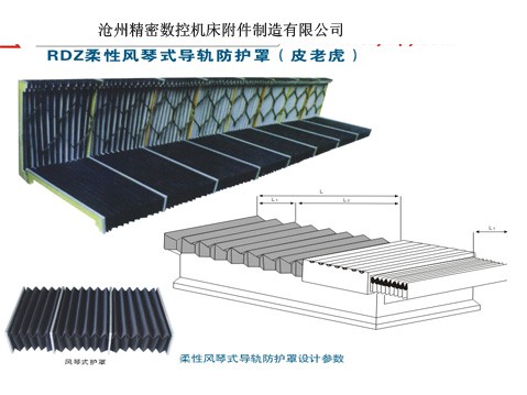 沧州金鼎机床附件制造有限公司专业生产整体伸缩片式风琴护罩,柔性风琴式机床导轨防护罩,风琴式防尘折布,风琴式防护罩,数控机床防护罩,导轨防护罩,皮老虎防护罩,伸缩护盖,一字形防尘折布、风箱。说明:本产品是由强力粘合胶与绝缘卷材高频热合机热压或缝制、折叠而成的。(1)此类护罩不怕脚踩、硬物冲撞不变形、寿命长、密封好和运行轻便等特点。(2)护罩行程长、压缩小、长度的比值为1:15或1:20。(3)护罩的材质有专用布、三防布、塑胶布、PVC布、石棉布、阻燃布等。具有防火、防油、防尘、耐高温、阻燃、耐酸碱、抗静电等特点。材质厚度从15丝到80丝。(4)此折叠护罩是最先进的一种形式,它能弥补其它护罩解决不了的问题。这类护罩在世界占有领先地位。适用于各种小中大型机床。在客户的特殊要求下,在护罩的内部可加同动弹簧。速度可达200m/分!标准护罩使用在机床立柱和机床导轨上结构合理行走均匀坚固耐用。根据用户要求,风琴式护罩除生产平面风箱式以外上面可带不锈钢片,也可生产圆型,起脊型、六角形、八角型等。也可根据客户提供的图纸加工制造。