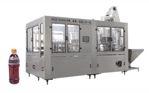 矿泉水设备:LTLD系列冲瓶、灌装、封盖三合一体机组-沈阳矿泉水设备-沈阳纯净水设备适用于各种果汁饮料、茶饮料的热灌装生产,同时更换少量的零部件,便可用于纯净水、矿泉水的灌装。产量4000-24000瓶/小时,可供用户选择。采用先进的微负压重力式灌装原理,灌装快、稳、准,设有完善的物料回流系统,也可实现回流时独立回气,不与物料接触,减少物料二次污染及氧化。本机能满足95℃以下热灌装技术要求,灌装阀及物料进出管路无卫生死角,同时配有CIP自清洗接口,封盖前设有对瓶口RO水冲洗装置,以确保瓶口无发霉现象。采用磁力扭矩式拧盖头,实现抓盖、拧盖功能。拧盖力矩无级可调,具有恒力矩旋封塑盖功能。整机采用人机界面触摸屏控制、PLC电脑程序控制、变频器控制等先进技术。具有供盖系统自动控制、灌装温度自动检测、物料高温报警、低温停机并自动回流、无瓶不加盖、缺瓶等待、缺盖停机等功能。