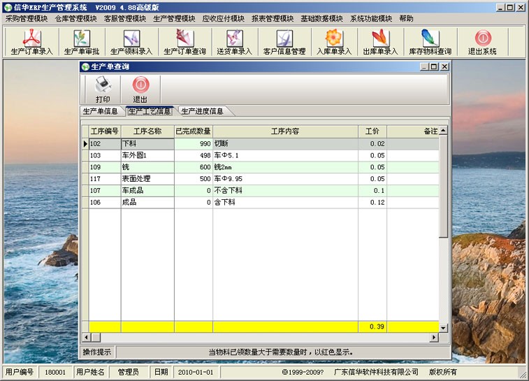 1.可以让企业从接单,下生产单,审批,物料采购、领用,生产过程跟踪,生产完成入库,送货,以及所产生的应收应付业务和所有管理报表,进行全过程的规范化管理。企业管理者很容易就了解到每张订单生产进程、生产单完成情况,保证每一张订单按时完成。