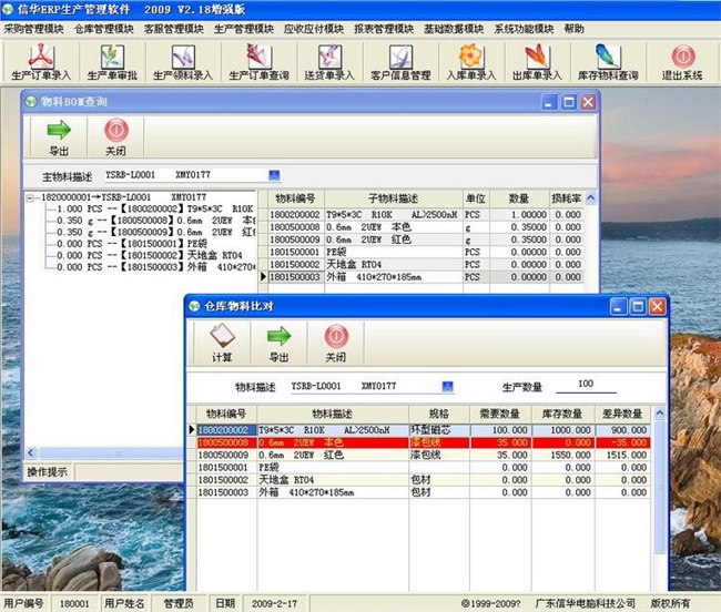 2.有完善的物料管理功能,可以设置成品BOM表(物料构成表),并可根据BOM表进行仓库物料比对,计算出成品生产所需整批物料的数量,还可生成缺料表,方便物料的采购和领用操作,随时可以查询到仓库物料的实有数量以及缺料情况,保证每一张订单足料生产。