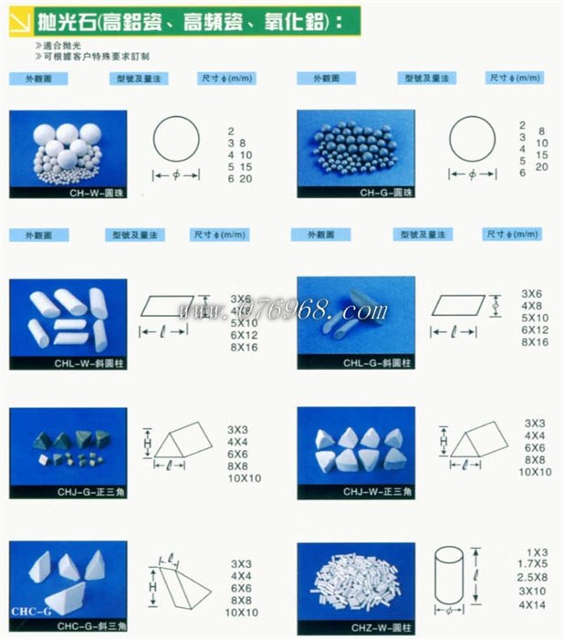 此种拋光石用于铝合金、锌合金、铜、树脂(塑料)等材质较软的产品表面拋光、电镀前细磨,常用于家私五金(如拉手、锁具等)及箱包五金(如皮带扣、箱包扣、鞋扣等),主要有圆形、三角形、斜三角形、圆柱形、斜圆柱形,用户可以根据产品的形状及大小来选择拋光石的规格,以下此种拋光石的主要规格: