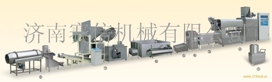 该线是继第二代膨化食品生产线之后的另一类高档小食品生产线。采用玉米淀粉,薯类淀粉为原料,利用独特的挤压成型工艺,使产品外形实现最佳的感观效果,产品造型自然逼真、质感细腻、口感酥松、不裂不散。该生产线设计合理,稳定性强,自动化程度高,主机采用先进的变频调速技术,高效节能。精确的参数控制及完善的工艺流程,确保加工产品质量稳定。是传统工艺与现代技术的完美结合。产品有螺旋、薯片、虾片、贝壳、圆管、刺螺、圆圈、波浪、泡司等几十种可供选择。