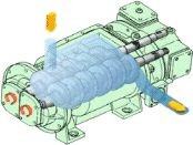 大晃开发的独特形状的螺杆(专利),它低速转动连续排气,真空度可达到10-1Pa,它可称为是划时代的干式真空泵。 单级结构简单,易于保养和维修,在排除凝聚性气体,腐蚀性气体和反应生成物的半导体工艺中以及在硅单晶制造的抽真空等领域也发挥着威力。
