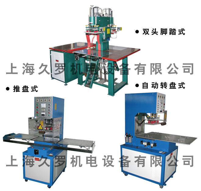 高频机/高频熔接机/高频焊接机/高周波塑胶熔接机 主要用于各种聚氯乙烯(PVC)为主的塑胶熔接、焊接等,并将不同形状泡罩或泡壳塑胶材质自动焊接同时自动切边。适用于双面吸塑焊接,吸塑泡壳与纸卡封合,特殊塑胶材质(PE,PS,PETG)的封合,30%以上PVC材质塑料焊接最好。吸塑包装(包括上下双泡罩热合切边,泡罩与纸板热合),汽车内饰皮革、商标、文具盒、雨衣、吹气玩具、塑料封面,水床,鞋类制品、坐垫,各种包装袋,手提软袋等的热合加工,各种凹凸形状的花纹图案、字母文字的压制,烫金等。