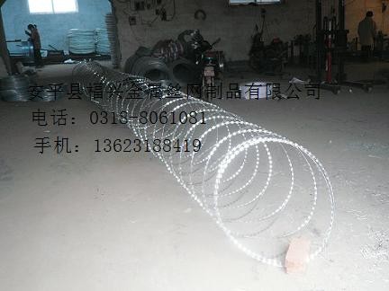 工 艺:它采用钢板(刀板)冲压成型包附于热镀锌钢丝(芯线)之上,由锐利尖角镀锌钢板或不锈钢薄板做刀片,高张力钢丝做芯线组合而成的。