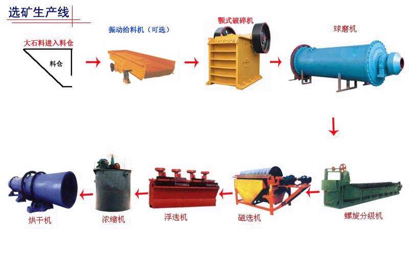 选矿生产线生产流程如下:开采的矿石先由颚式破碎机进行初步破碎,在破碎至合理细度后经由提升机、给矿机均匀送入球磨机,由球磨机对矿石进行粉碎、研磨。经过球磨机研磨的矿石细料进入下一道工序:分级。螺旋分级机借助固体颗粒的比重不同而在液体中沉淀的速度不同的原理,对矿石混合物进行洗净、分级。经过洗净和分级的矿物混合料在经过磁选机时,由于各种矿物的比磁化系数不同,经由磁力和机械力将混合料中的磁性物质分离开来。经过磁选机初步分离后的矿物颗粒在被送入浮选机,根据不同的矿物特性加入不同的药物,使得所要的矿物质与其他物质分离开。在所要的矿物质被分离出来后,因其含有大量水分,须经浓缩机的初步浓缩,再经烘干机烘干,即可得到干燥的矿物质。