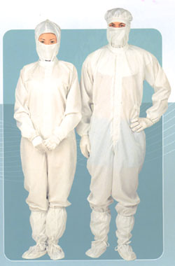 防静电连体服面料有:2.5mm/5mm条纹;2.5mm/5mm网格导电绸,适用于高洁净无尘环境,本产品可适应于10~10000级无尘环境使用。