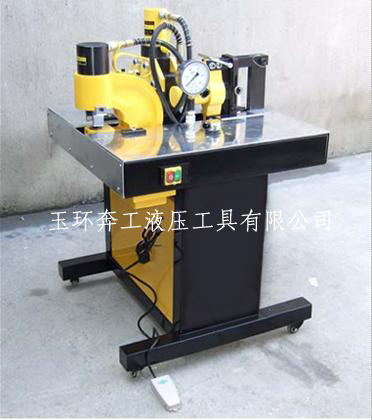 本机系参照国外先进产品,并结合国内实际为提高工作效率及保证作业安全之要求而设计的配套设备。最适合制作大型的电控箱及输配电建设工程的施工现场使用。灵活性高,体积小而功能强,生产能力及工作效率极高。低噪无害,加工成品美观且不会对工作环境造成污染。工作范围(弯排、冲孔、剪切)外增加另一阀门控制3m油管可配套压接端子、剪切电缆或压花等工作,实现一机多用。 三合一母线加工机DHY-150 功能 :切断、冲孔、平弯 流动工作台尺寸 :850mm(长)×650mm(宽) ×1200mm(高) 输入电压 :单机50HZ、220V 额定工作油压 :700kgf/cm2(超高压安全阀设定值) 切排机出力 :25ton 切排能力 : 铜排/铝排200mm×12.5mm 冲孔机出力 :31ton 孔中到排边距离 :75mm/110m 标准配套冲孔模具 :冲孔Φ7mm、Φ9mm、Φ10.5mm、Φ13.8mm、Φ17mm、Φ20.5mm 弯排机出力 :25ton