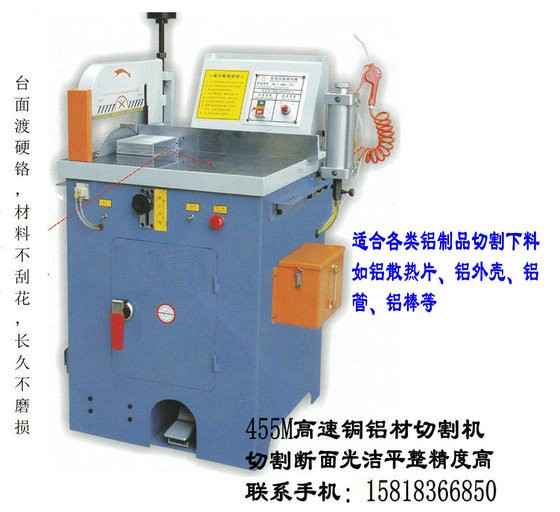 455M半自动高速铜铝切割机,采用镶钨钢圆锯片切割,主轴转速3200转/分,采用气油转换作为机器进刀压料动力,锯片由下住上切割,自动压料与切割,机器自动喷油雾润滑,切割材料断面光洁无毛刺,精度高,可单支与多支切割,操作简单安全,适合各类铝产品切割下料,铝棒,铝管,铝条等铝型材锯切下料,如铝散热片,硬盘外壳,手机外壳,MP3及U盘外壳等铝型材.