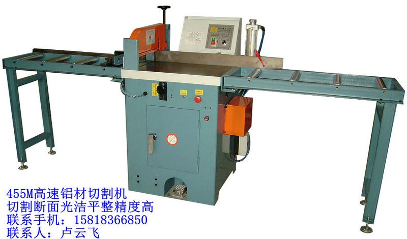 455M半自动高速铜铝切割机,采用镶钨钢圆锯片切割,主轴转速3200转/分,采用气油转换作为机器进刀压料动力,锯片由下住上切割,自动压料与切割,机器自动喷油雾润滑,切割材料断面光洁无毛刺,精度高,可单支与多支切割,操作简单安全,适合各类铝产品切割下料,铝棒,铝管,铝条等铝型材锯切下料,如铝散热片,硬盘外壳,手机外壳,MP3及U盘外壳等铝型材.